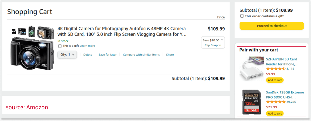 For example, when customers add a camera to their cart, you can show single upselling items like memory cards as the “You May Also Like” Or “Pair With Your Cart” section on cart pages.