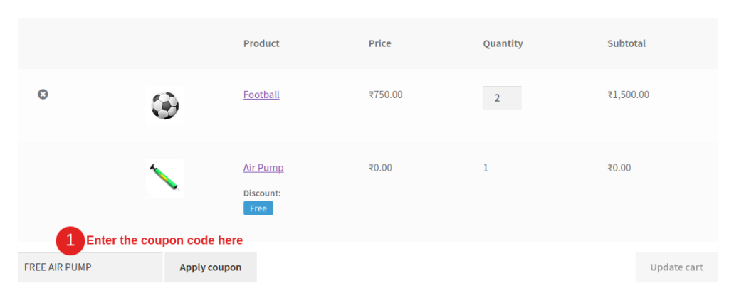 When customers add two footballs to their cart, this is how the free product coupon gets displayed on the cart page.