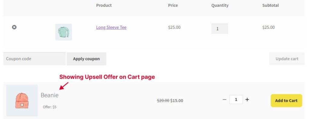 Example: Showing ‘Beanie’ as an upsell product on the cart page when a customer buys any products from the store.