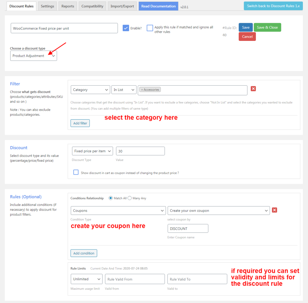 If any additional configuration is to be included like coupon, cart conditions, cart items, and so on can be done in the “Rule” section which is optional. You can even set validity to your discount rule in this section.