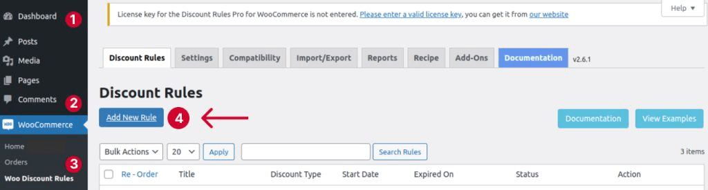 1. Navigate to the “WordPress” Dashboard -> “WooCommerce” -> “Discount Rules.”