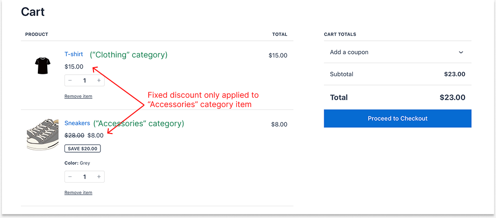 - Product discounts: Instead of categories, you can apply discounts only to specific products, such as a $10 discount on the cap.