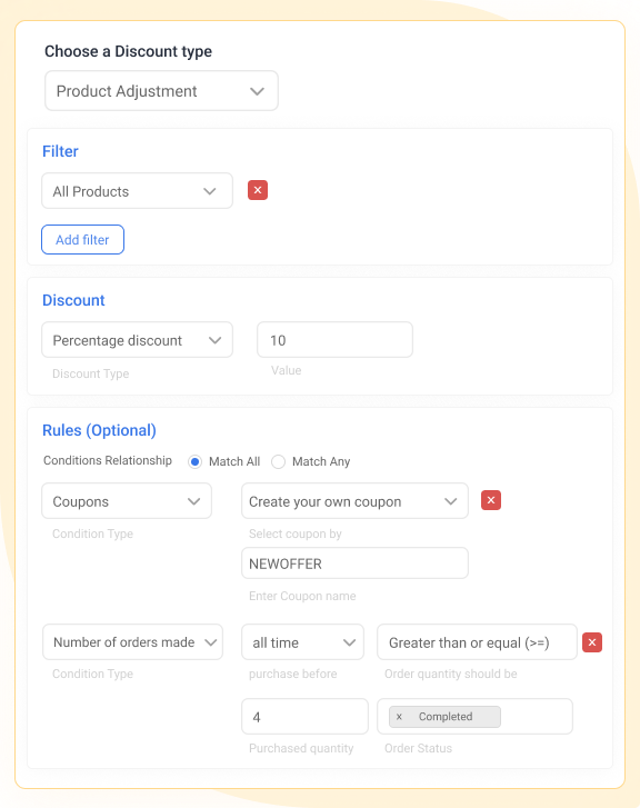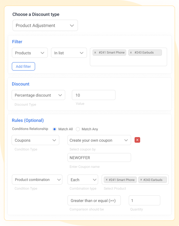 Design a variety of coupons to fit your needs, including BOGO (Buy One Get One) offers, bulk discounts, bundle promotions, free shipping deals, user-role specific discounts, Nth order incentives, festival specials, and more.
